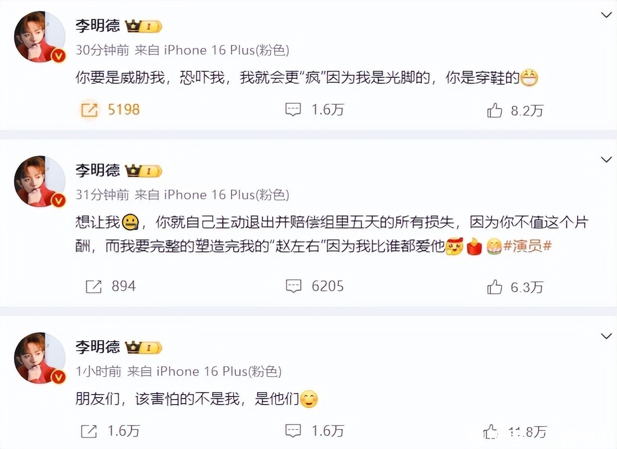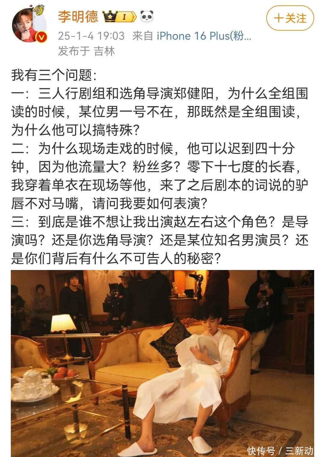 搜狐文娱讯 1月4日,演员李明德在个东谈主酬酢账号发文,质疑场合的《三东谈主行》剧组男一号在片场搞特等,进而引起网友热议。