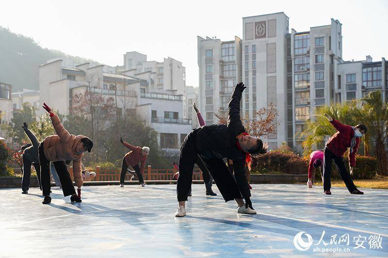 朝晨,薄雾褪去,冬日暖阳洒进黄山合作公社,65岁的李建平,正和姐妹们在露天篮球场跳着早操。