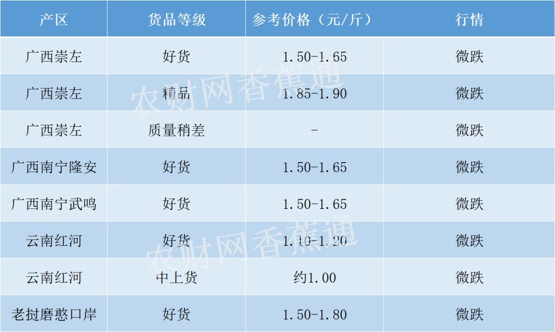 广西崇左市集妙品主流意向价钱为1.50-1.65元/斤,高价较上一来去日跌0.05元/斤。佳构货源1.85-1.90元/斤,质地稍差货源价钱偏低。市集走货一般,产区货源供应未几;销区市集需求清淡,询货客商较少。