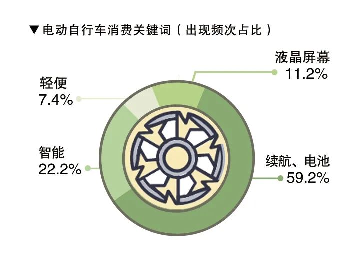 年青东谈主偏好购买更年青化、智能化的产物,与现时电动自行车智能化的趋势相匹配,“续航、电板”以及“智能”“随和”成为浮滥者购买电动自行车时最体恤的身分。其中“续航、电板”关键词出现频次占比近60%。