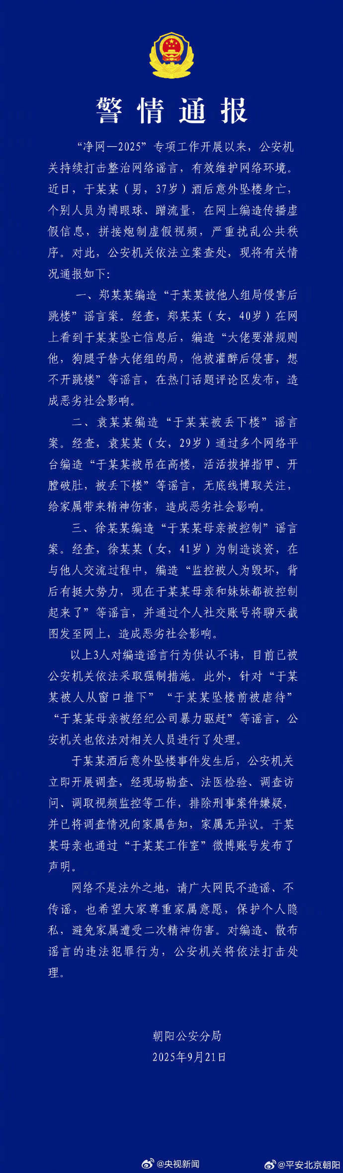 同日,于浪漫责任室发文证明了于浪漫坠楼身死的音书。