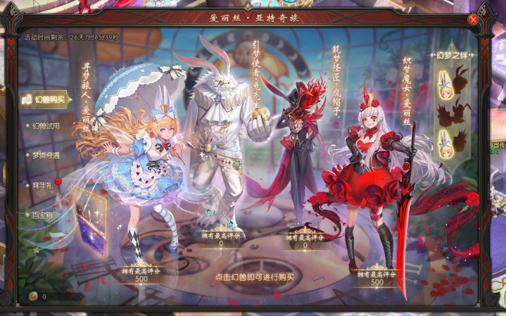 说真话,2023年看到兔年幻兽“梦幻来客”系列时,我是有点懵的——这细目是《魔域》的年兽?爱丽丝姐妹、兔先生、疯帽子,一套组合拳径直把《爱丽丝梦游瑶池》搬进了《魔域》的寰球。蓬蓬裙、怀表、夸张弁冕,手段殊效不是花瓣便是卡牌,透顶跳出了以往新年幻兽的“神兽”框架。