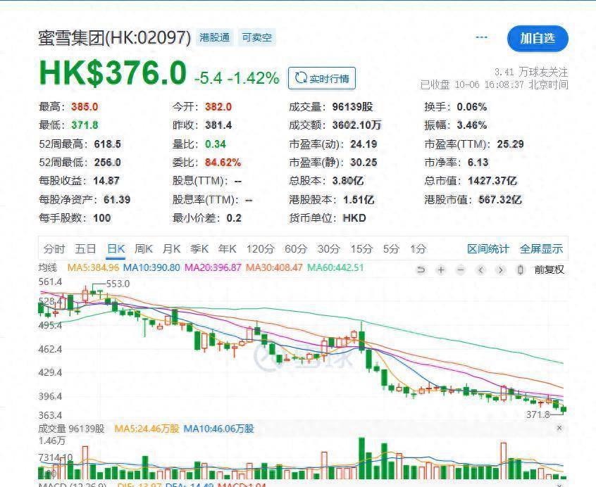 限度10月6日港股收盘,蜜雪集团(2097.HK)股价报376港元/股,当日着落1.42%。拉万古刻线来看,在已往的三个月里,蜜雪集团股价已着落四成,市值缩水至1427亿港元,较本年7月初已挥发500亿港元。