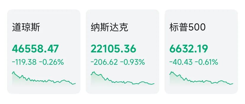 当地技术周五,好意思股三大股指全线收跌,谈指跌0.26%报46558.47点,标普500指数跌0.61%报6632.19点,纳指跌0.93%报22105.36点。从全周来看,谈指累计跌1.99%,标普500指数跌1.6%,纳指跌1.26%。