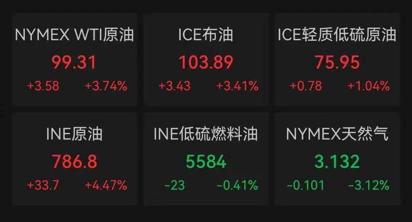 巨额商品商场中,中东垂危时势抓续推高海外原油价钱。规矩3月13日收盘,NYMEX WTI原油大涨3.74%,报99.31好意思元/桶,本周累计高涨9.25%;ICE布油收涨3.41%,报103.89好意思元/桶,本周累计涨幅超12%。