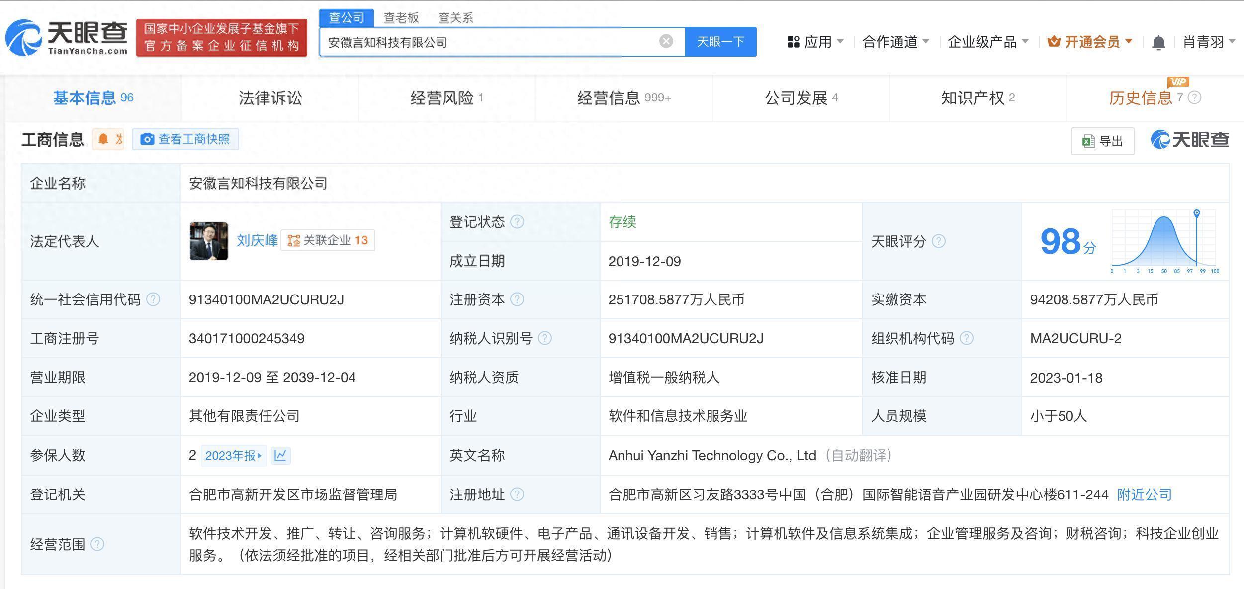 安徽言知科技有限公司斥地于2019年12月🦄开云彩票(中国)官方网站,法定代表东谈主为刘庆峰,注册成本约25.17亿东谈主民币,规画领域含筹算机软硬件、电子居品、通信设备开发、销售等,由科大讯飞首创东谈主刘庆峰、田明、安徽省三重一创产业发展基金有限公司、合肥市创业投资带领基金有限公司等共同握股。对外投资信息露出,该公司为科大讯飞(002230)激动。